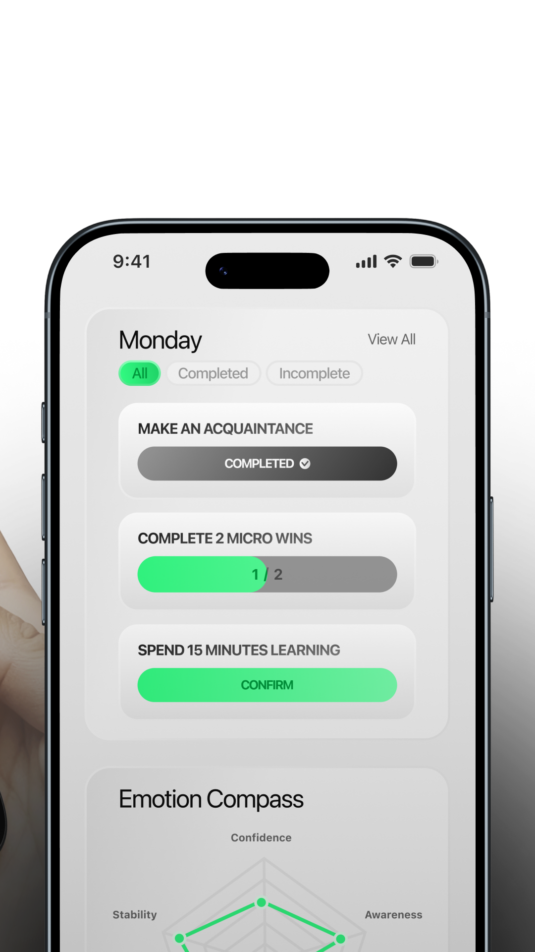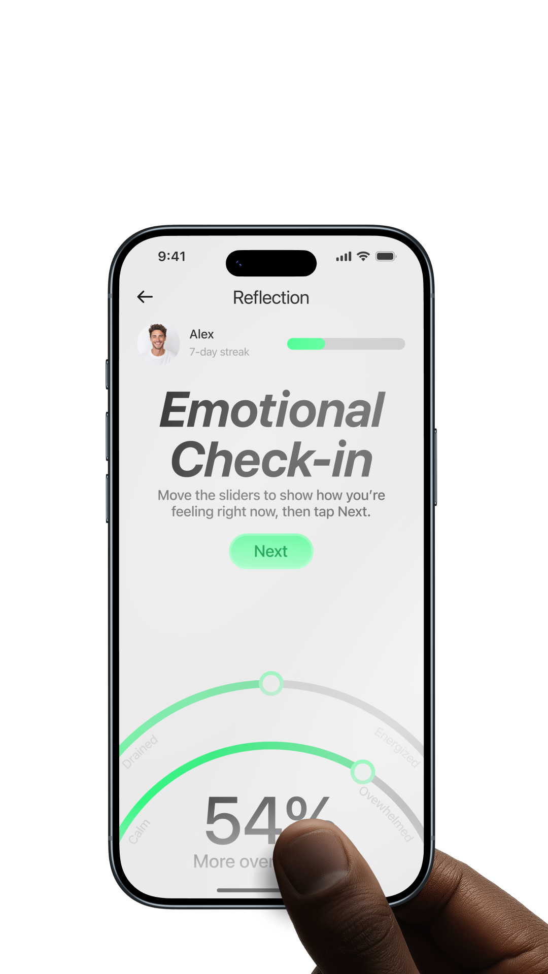 The Emotional Check-in reads where you are and routes you to the right tool, mode or reflection — in under 30 seconds.