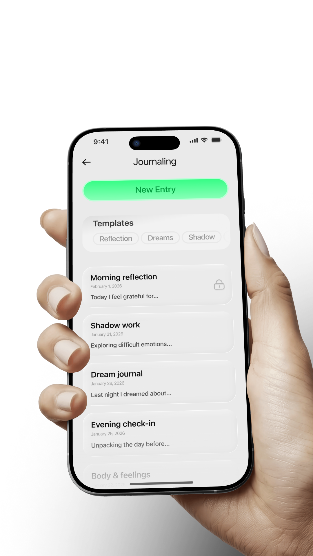 Write free-form or pick a guided template — whatever fits the moment. Insight Cards when you need a shift in perspective. Cognitive Reframing built right in. Shadow logs with an optional lock. Everything encrypted, everything yours.